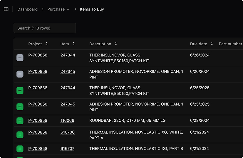The application simplifies complex ERP functionality, presenting only the essential information needed by managers, purchasers, or workers, right when they need it. Whether you’re overseeing production or handling day-to-day tasks, Visual Tracking gives you immediate access to relevant data and a clear overview of your responsibilities.